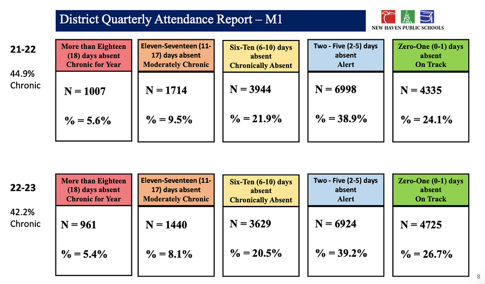 She also said that 5.6 percent of NHPS students have already missed at least 18 days of school. That means that they have already passed the threshold of chronically absent for the entire school year, which began at the end of August and ends in June.