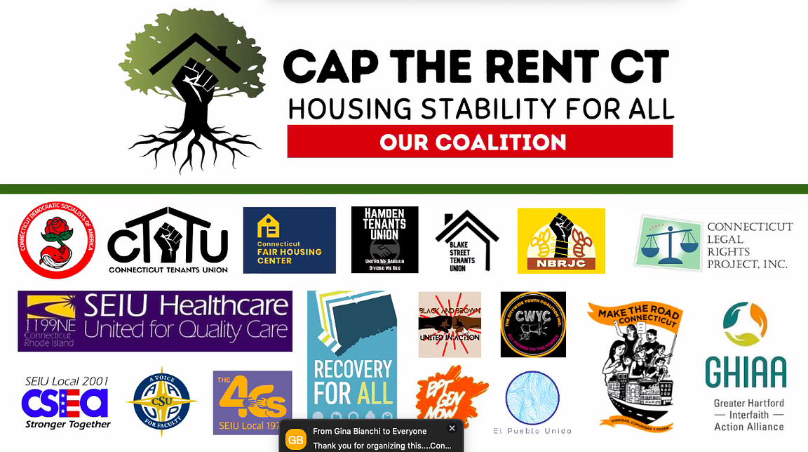 Thursday’s meeting marked the official launch of a new “Cap The Rent” campaign, championed by the DSA and tenants unions in New Haven, Hamden, and Hartford, alongside the Connecticut Fair Housing Center; SEIU locals 1199, 1973, and 2001; AAUP-CSU (state universities’ faculty union), El Pueblo Unido, Black and Brown United In Action, Citywide Youth Coalition, BPT Gen Now, Greater Hartford Interfaith Action Alliance, Make The Road Connecticut, Recovery For All, NBRJC, and the Connecticut Legal Rights Project.